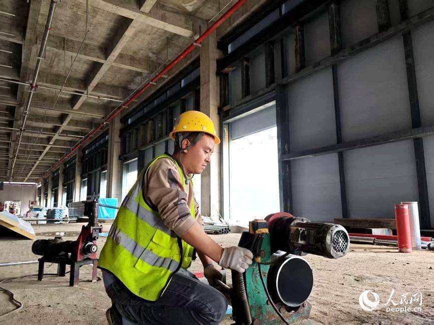 中建五局四公司一项目水电工在进行消防管道加工作业。人民网记者 尚明桢摄