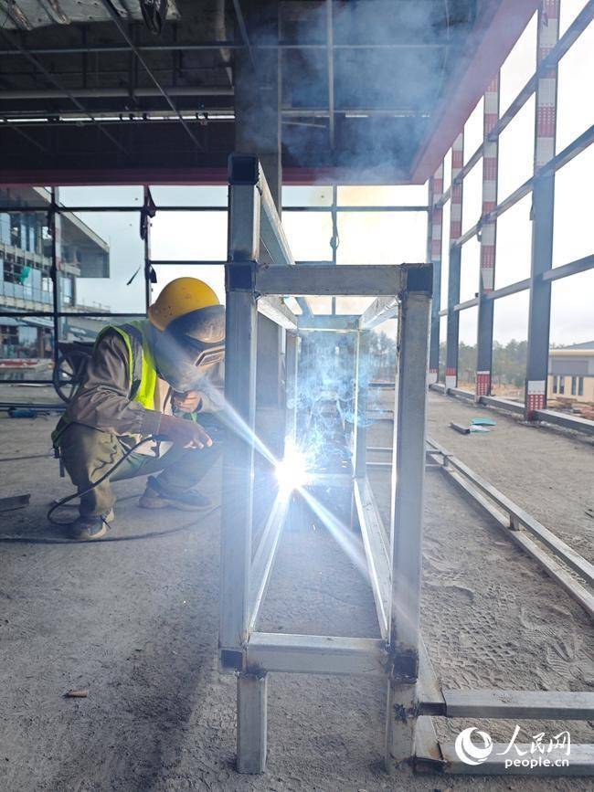 中建五局四公司一项目上,精装班组王师傅正在焊接接待吧台骨架。人民网记者尚明桢 摄