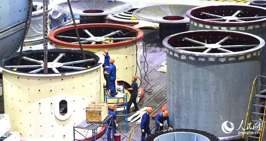 河南省洛阳市的中信重工装配车间内,工人正在起吊装配出口海外的矿业装备磨机筒体产品订单。人民网尚明桢 摄