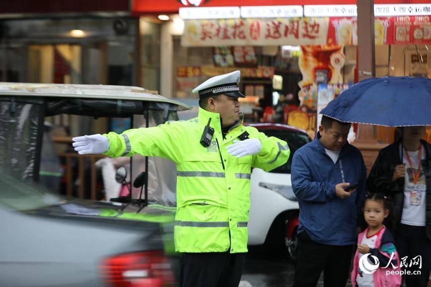交警在雨中指挥交通。人民网记者 王佩摄