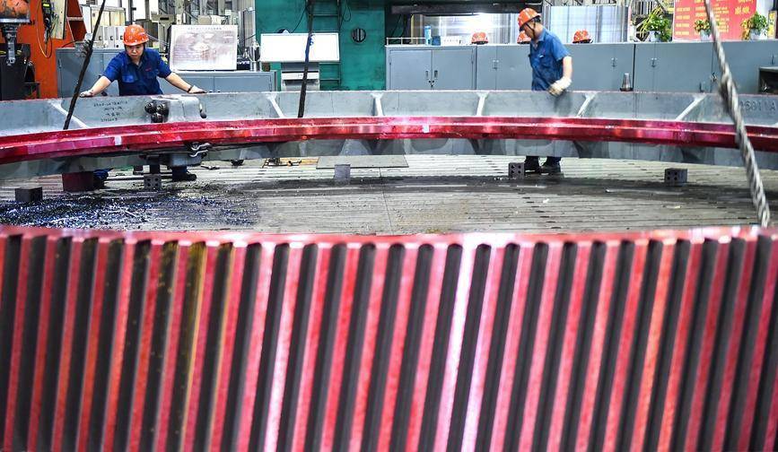 河南省洛阳市的中信重工机加车间内,工人正在起吊加工出口海外的矿业装备磨机齿圈产品订单。黄政伟摄