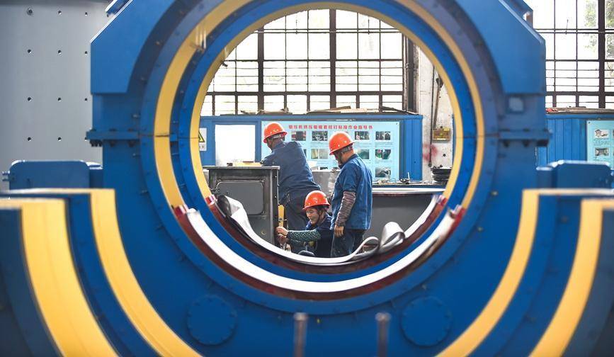 河南省洛阳市的中信重工装配车间内,工人正在装配出口海外的矿业装备磨机产品订单。黄政伟摄
